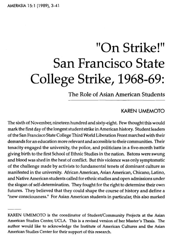 - The references at the end of the encyclopedia entry includes one to an article, Umemoto, Karen. 1989. “‘On Strike!’ San Francisco State College Strike, 1968–69: The Role of Asian American Students.” Amerasia Journal 15: 3–41. I cut & paste the article title into UW Libraries Search and find we have Amerasia Journal online!