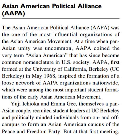 - I search Asian Americans: An Encyclopedia of Social, Cultural, Economic, and Political History for quick information on the organization. I find an entry for the group and discover that it was formed at UC Berkeley in 1968 by Yuji Ichioka and Emma Gee. AAPA published a newsletter (first issued in Nov/Dec. 1968 -- maybe I can track this down. It would be a great primary source!). Major concerns of the group: US militarism & ethnic studies. Other terms gleaned from the encyclopedia entry: Third World Strikes at San Francisco State College, Yellow Identity, I Wor Kuen, Amerasia Journal.