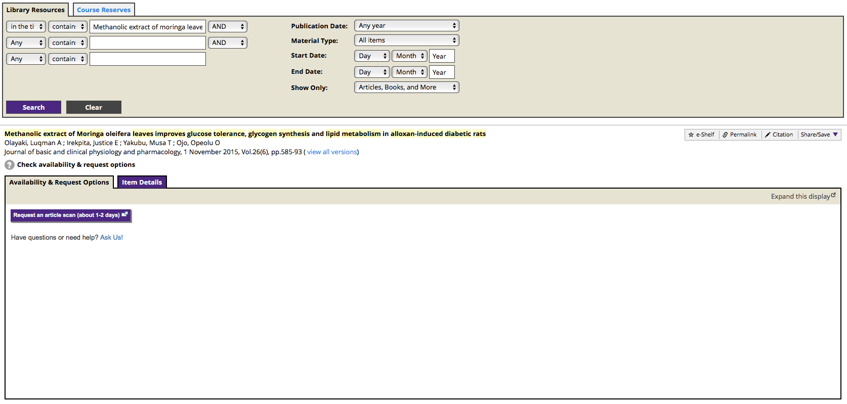 The catalog record shows if online access to the journal is available. It also shows where the item is located.